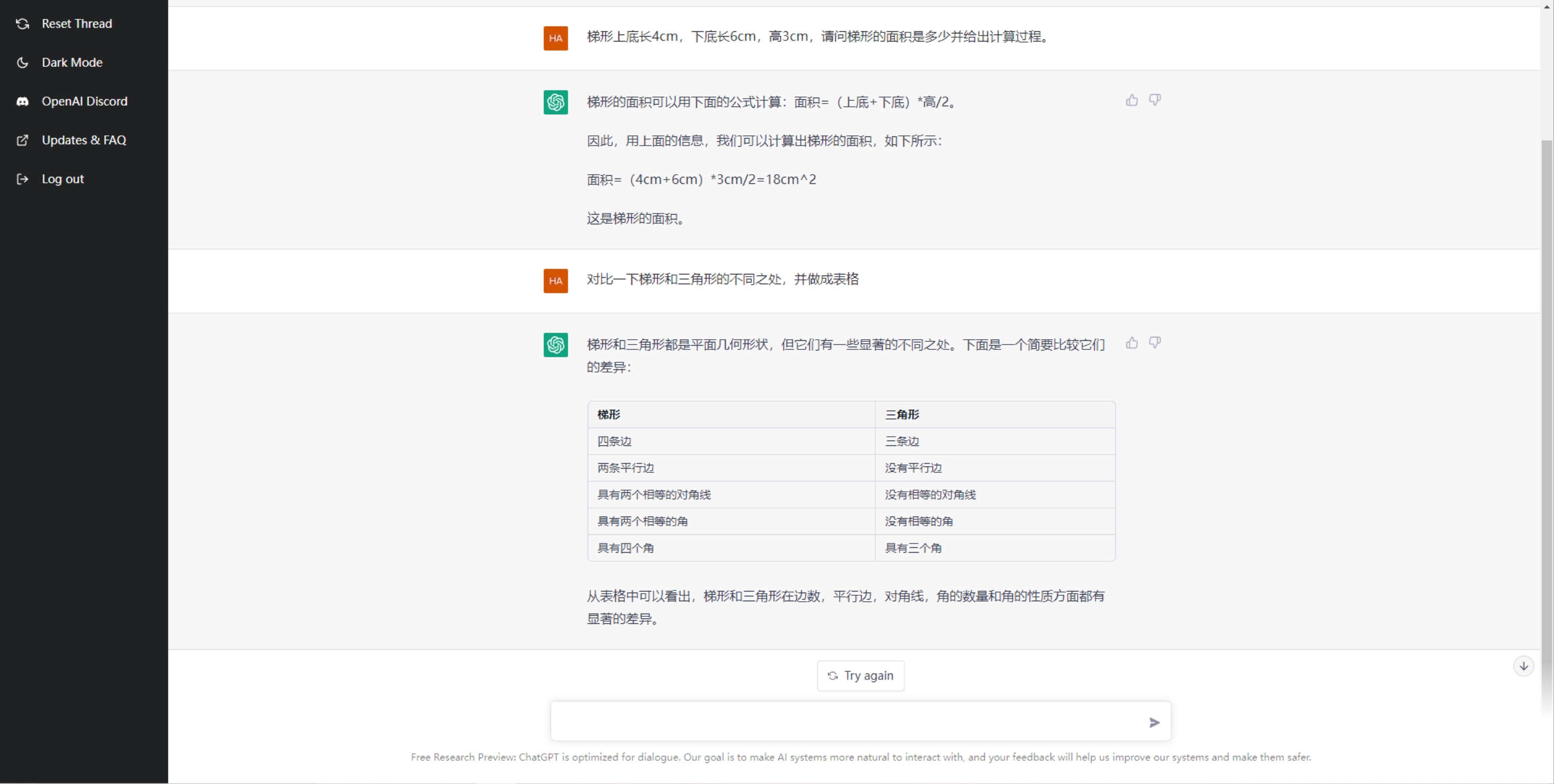 比如我们问一下 ChatGPT 梯形相关的问题,看看他会怎么回答。