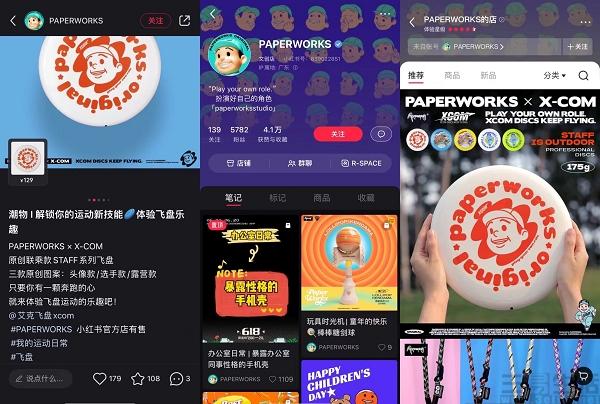 其中以小红书某原创设计品牌为例,在其所发布有关飞盘的笔记下方,就直接显示了售卖链接,而这一品牌的销售渠道也仅小红书这一个平台。并且在该品牌的个人资料下方,则包括了“店铺”、“群聊”、“R-SPACE(小红书数字艺术平台)”三部分。